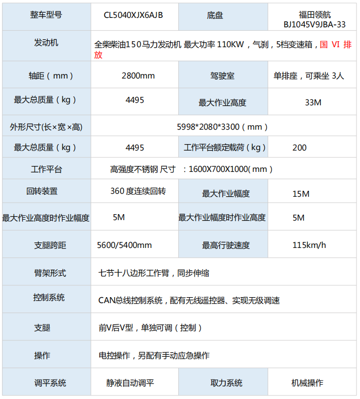 二、上裝配置:整車采用 CAN 總線系統(tǒng),并配備無線遙控器,360°可旋轉(zhuǎn)作業(yè)平臺 ,前 V 后 V 型支腿,橫向跨距更寬,穩(wěn)定性更強,可配有“軟腿”保護功能。臂架采用 7 節(jié)鋼絲繩伸縮結(jié)構(gòu),十八邊形工作臂,同步伸縮,結(jié)構(gòu)緊湊,作業(yè)效率高,作業(yè)范圍大。