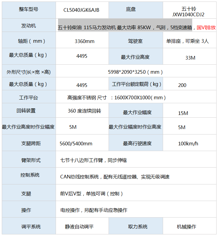 二、上裝配置:整車采用 CAN 總線系統(tǒng),并配備無線遙控器,360°可旋轉(zhuǎn)作業(yè)平臺 ,H型支腿,橫向跨距更寬,穩(wěn)定性更強(qiáng)。轉(zhuǎn)臺和吊籃設(shè)有啟動和熄火開關(guān),配置應(yīng)急泵。作業(yè)高度33米。