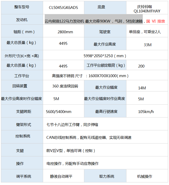 二、上裝配置:整車采用 CAN 總線系統(tǒng),并配備無(wú)線遙控器,360°可旋轉(zhuǎn)作業(yè)平臺(tái) ,H型支腿,橫向跨距更寬,穩(wěn)定性更強(qiáng)。轉(zhuǎn)臺(tái)和吊籃設(shè)有啟動(dòng)和熄火開(kāi)關(guān),配置應(yīng)急泵。作業(yè)高度33米。