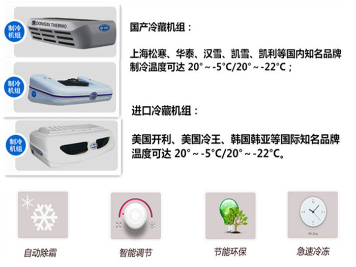 三、選裝冷機(jī):可根據(jù)客戶的用車需求選擇不同的機(jī)組,客戶可選-5℃、-10℃、-15℃、-18**-20℃冷藏機(jī)組 ,冷藏機(jī)組品牌有國(guó)產(chǎn)勁達(dá)K牌、韓亞、漢雪、華泰、松寒、凱雪、超酷..等冷藏機(jī)組,進(jìn)口冷藏機(jī)組品牌有:美國(guó)開利、美國(guó)冷**。冷藏機(jī)組分為**機(jī)組和分體機(jī)組!根據(jù)您的用車需求推薦合適的冷藏機(jī)組! 該車型可選裝“制冷+加熱”雙溫機(jī)組(**溫度范圍為+20℃**-18℃)可用于東北地區(qū)及內(nèi)蒙 ** **等嚴(yán)寒地區(qū)!